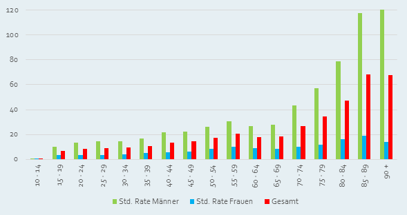 Standardisierte Suizidraten pro 100.000 Einwohner*innen (5-Jahres-Durchschnitt 2014–2018) nach Altersgruppen